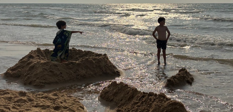 Despite the threatening clouds, it was a warm day, swelteringly warm, even. The boys had worked on their sandcastle all afternoon. It was to be the biggest fort ever, surrounded by a maze of tiny channels and walls meant to protect it from the rising tide. They had hoisted the pirate flag to keep unwanted visitors away. Other children looked on with envy, and beachgoers walked around it in a wide arc, casting admiring glances. One bold mermaid asked to be photographed next to the pirate flag. The proud builders were happy to oblige the youthful beauty. The sea was calm, very calm. And yet, slowly but surely, it crept closer. When the sun broke through the clouds briefly in the late afternoon, the boys decided to take a dip in the cool water. Gleefully, they splashed around in the waves, which were steadily advancing toward the beach, and their pirate fort. Meanwhile, little rivulets had begun nibbling away at the walls of their creation. The boys came running back, excited. The dark clouds were closing in too. Suddenly, fat drops began to fall from the sky; beachgoers hurriedly packed up and left. But the boys didn’t give up. We huddled together under our large beach towel. They watched in fascination as the sea slowly but surely reclaimed the shore. Then the sun broke through again, and the boys danced excitedly around their ever-crumbling structure, until the last wall of sand was swallowed, and every little trench was claimed once more by the sea. We gathered our things and left. We looked back one last time: the biggest sandcastle ever had been conquered by the sea. Only the sea remained, quiet, as if nothing had ever been there. The castle was gone, but the day would remain.
